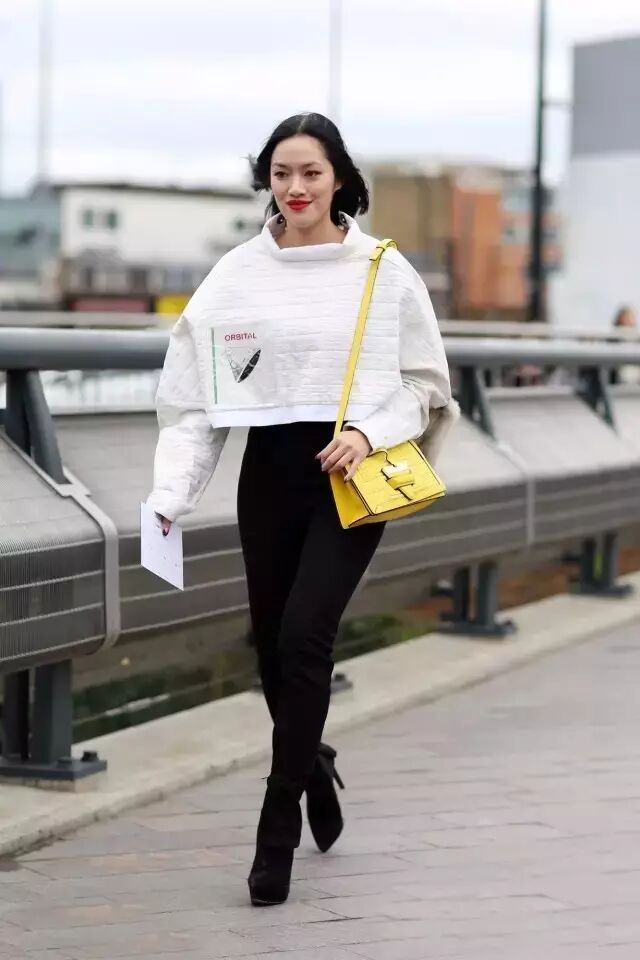 一件精致的钉珠装饰卫衣绝对是出街的吸睛利器,如何避免这种大廓型的外套带来的臃肿感呢,完美解决的办法就是搭配露出纤细脚踝的短靴,让整体在视觉上取得一个平衡。