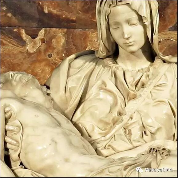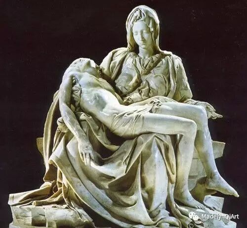 米开朗基罗的一尊雕塑作品用得正是这个名字,表现的是圣母怀抱着刚从十字架上被放下来的耶稣的遗体。那哀伤的眼神将母爱展现出来,耶稣死时有点怨却依然安详的面容,失去力量控制的手臂,玛丽亚低垂的眼帘,微微上挑的眉宇间那一抹哀伤展现得淋漓尽致。整个雕塑中的人物形成鲜明对比,让人深刻感受到耶稣死亡的祥静和圣母无尽的悲哀。