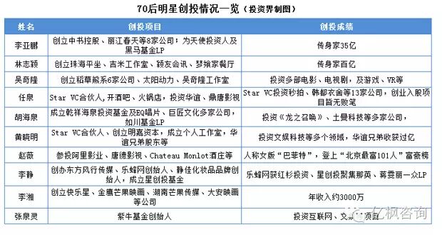 正如70后越来越成为社会的中坚力量,他们在娱乐圈也是如此,就连做创投也是最庞大、最突出的一群。70后创投明星数量众多,除了表中列举的10位明星外,汪峰、李晨、周杰伦、佟大为、黄磊、徐静蕾、林心如、李冰冰、章子怡等多位明星的创投成果颇丰。