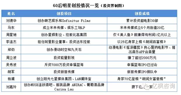 60后在创投界表现突出的明星目前多已是演艺圈的“大腕儿”,他们有充足的资金、较高的视野、广阔的人脉来发展自己事业的第二春,因此60后明星的创投事业有以下特点: