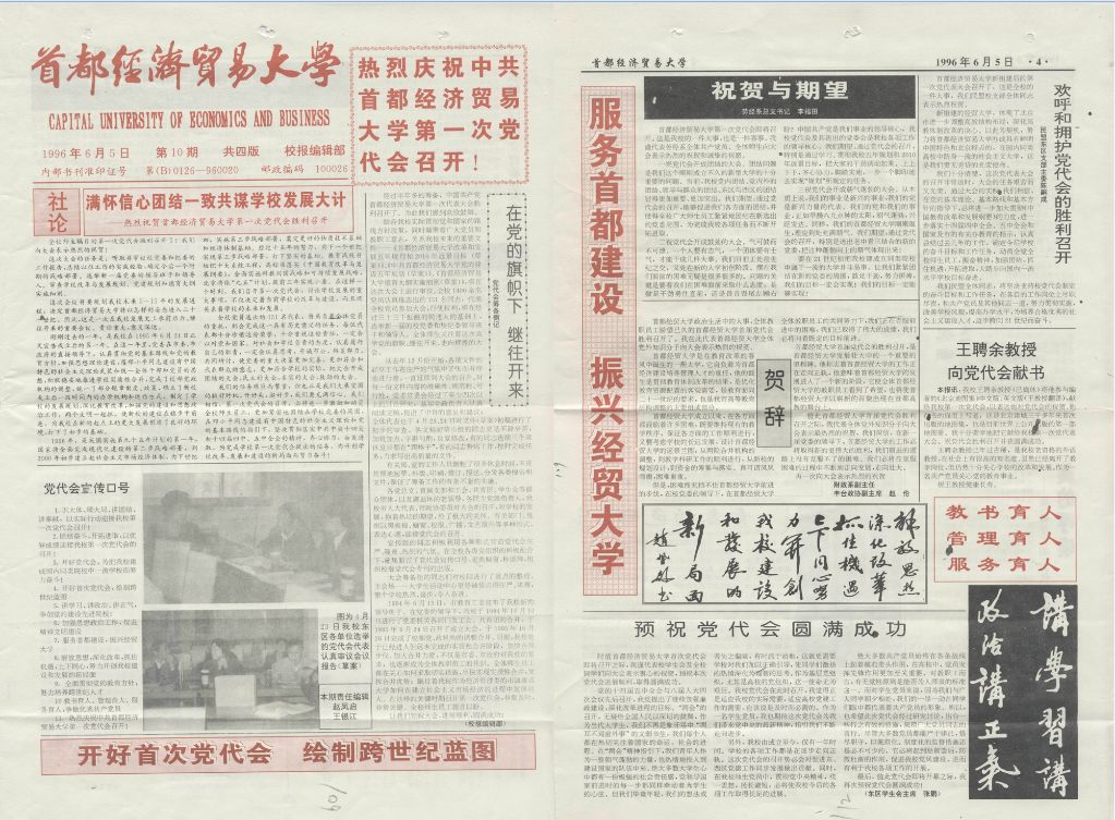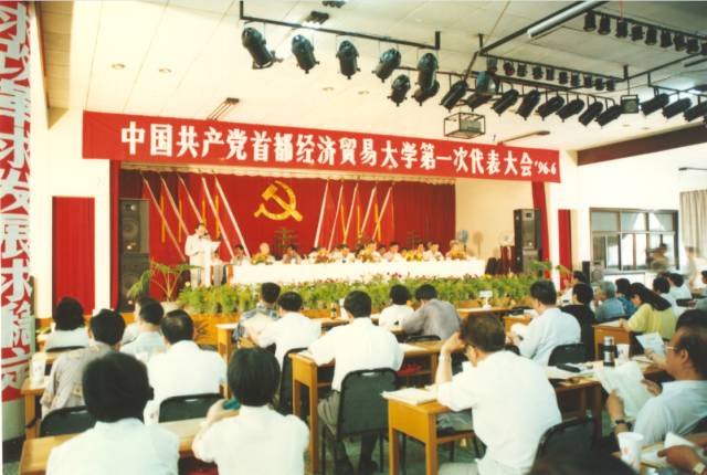 1996年6月5日至7日,首都经济贸易大学召开第一次党员代表大会,学校 1464 名党员,出席大会代表 151 名,列席代表 37名,党外特邀嘉宾 16 名。北京市委教育工委常务副书记、市教委副主任尹栋年出席会议并讲话。
