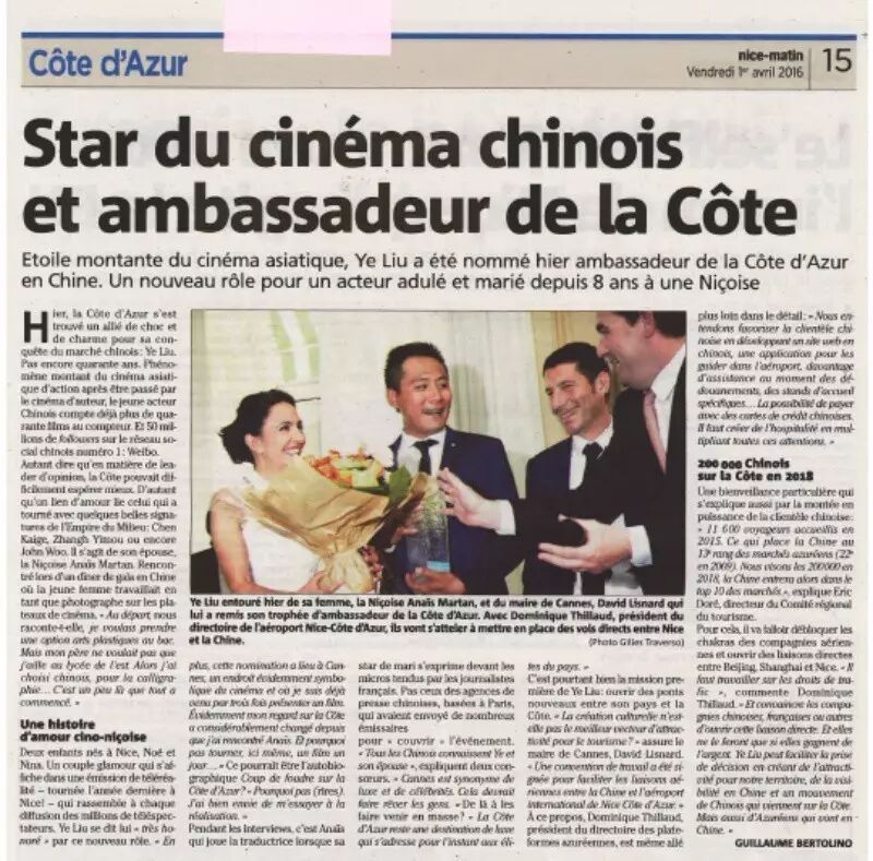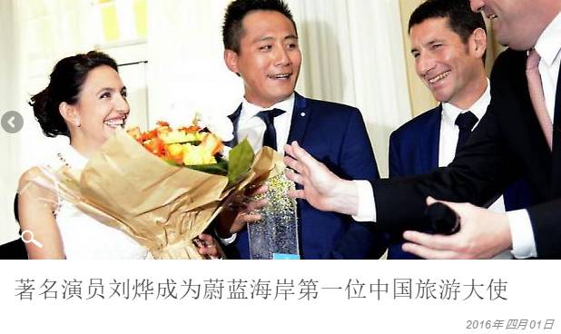 今年为了更多吸引中国游客,蔚蓝海岸旅游局请了影帝,真人秀红人刘烨担当旅游局形象大使。