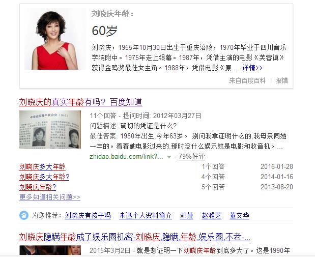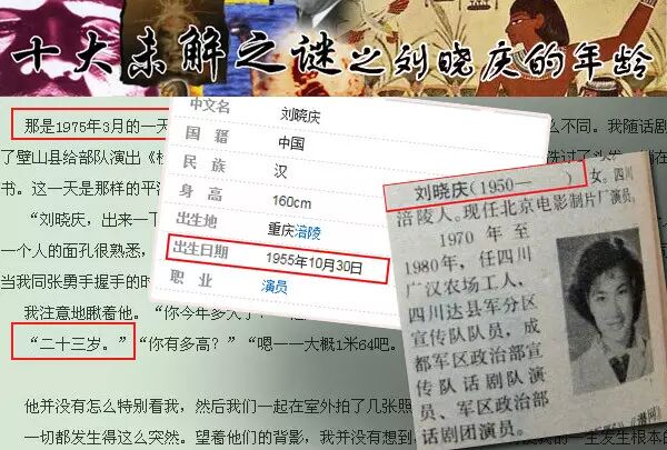 刘晓庆的年龄一直扑朔迷离,她曾在80年代《我的路》中提到自己1975年满23岁的事实,那么照此推论她应当是1952年生人,但是百度百科却显示她出生于1955年。又有好事的网友挖出当年“全国青年联合会”刊登的消息,竟然显示刘晓庆出生于1950年!