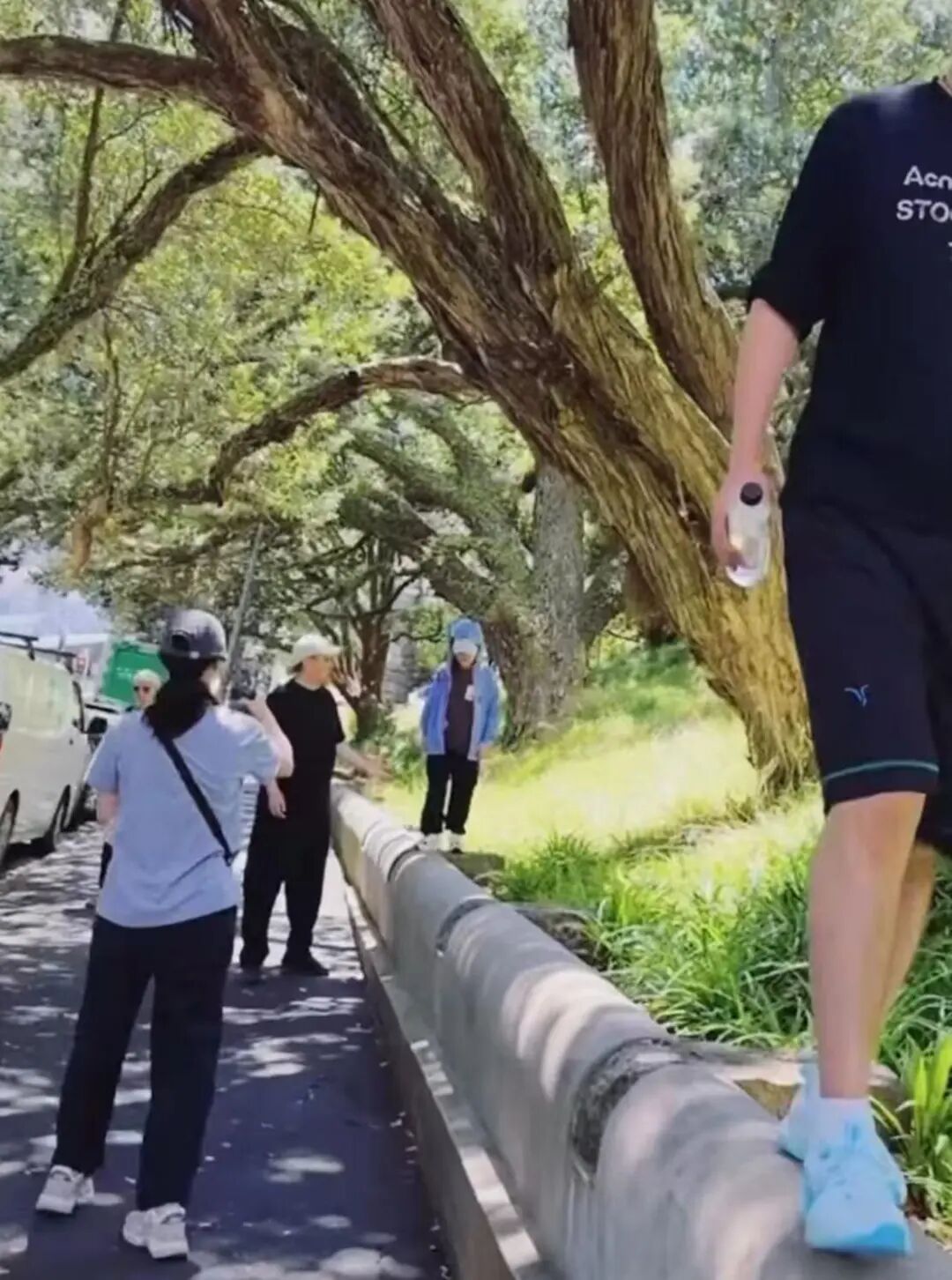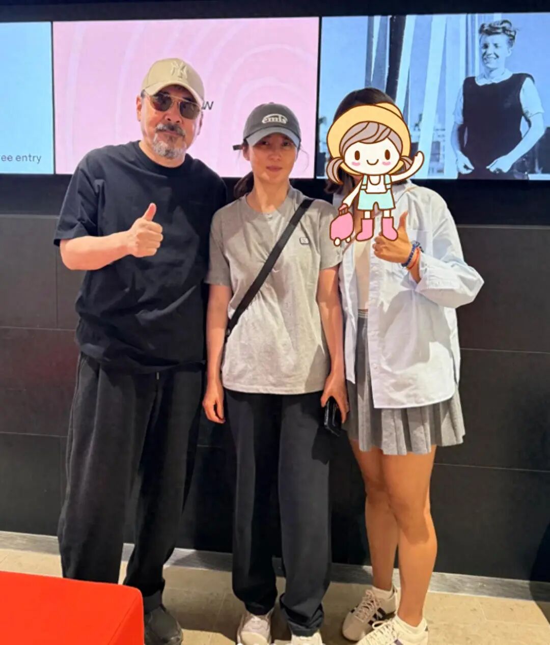 蒋勤勤被女粉丝和陈建斌夹在中间,她戴着深灰色棒球帽,上身浅灰色 T 恤,下身黑色长裤,肩上挎着黑色链条包。她左手自然下垂,右手拿着手机,脸上带着淡淡的笑,整个人温婉又从容。