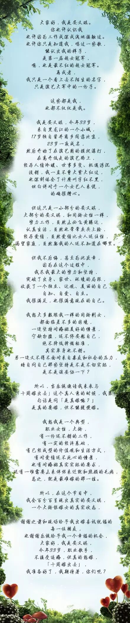 就在大家还在猜测安又琪这十年经历了些什么,为何结婚请柬上没有新郎的名字的时候,今天安又琪就为我们揭晓了答案,她决定参加乐视的《棘宝·十周嫁出去》的节目,而且这不是一档简单意义上的真人秀,这次她是要真的嫁,就看你敢不敢娶!