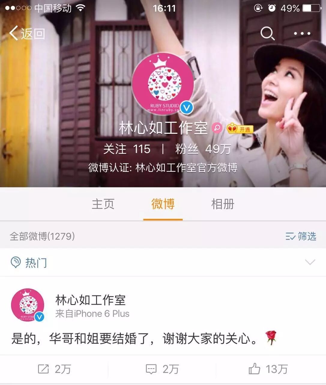 7月5日上午,有台媒报道霍建华爸爸承认了儿子的婚讯,表示儿子成家他十分开心,并说一定会到现场祝福新人,但其它细节不愿多谈,把发言权交给年轻人。直到中午,霍建华林心如才在工作室微博承认要结婚的喜讯,并向确认了时间地点:7月31日,巴厘岛。恭喜啦!