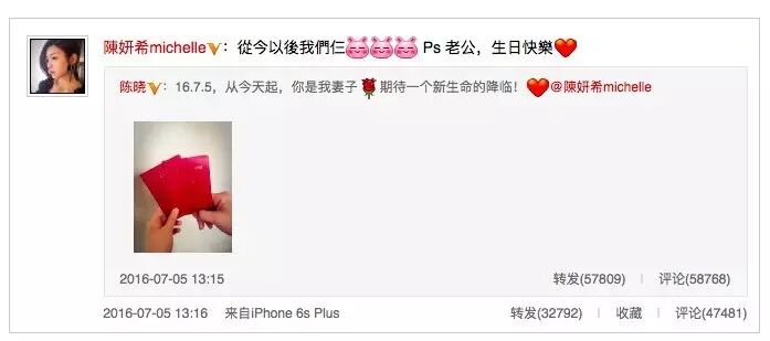 7月5日中午,陈晓微博宣布婚讯并配文:“16.7.5,从今天起,你是我妻子,期待一个新生命的降临!”。随后陈妍希转发该微博并佩文:“从今以后我们仨。老公,生日快乐!”,亲证自己已经怀孕。