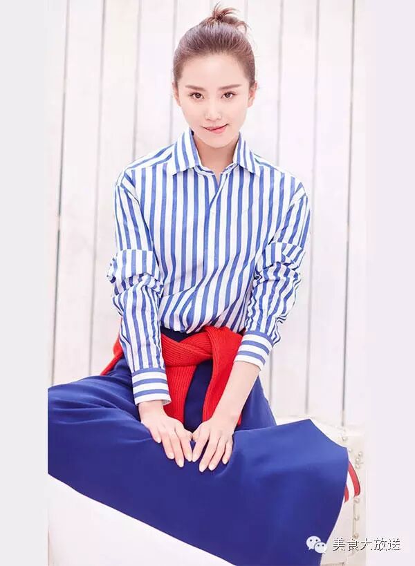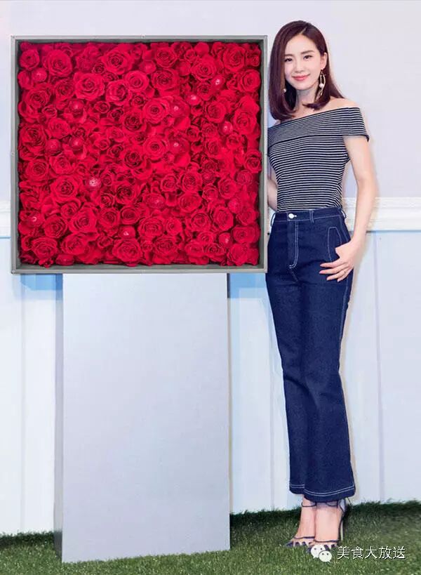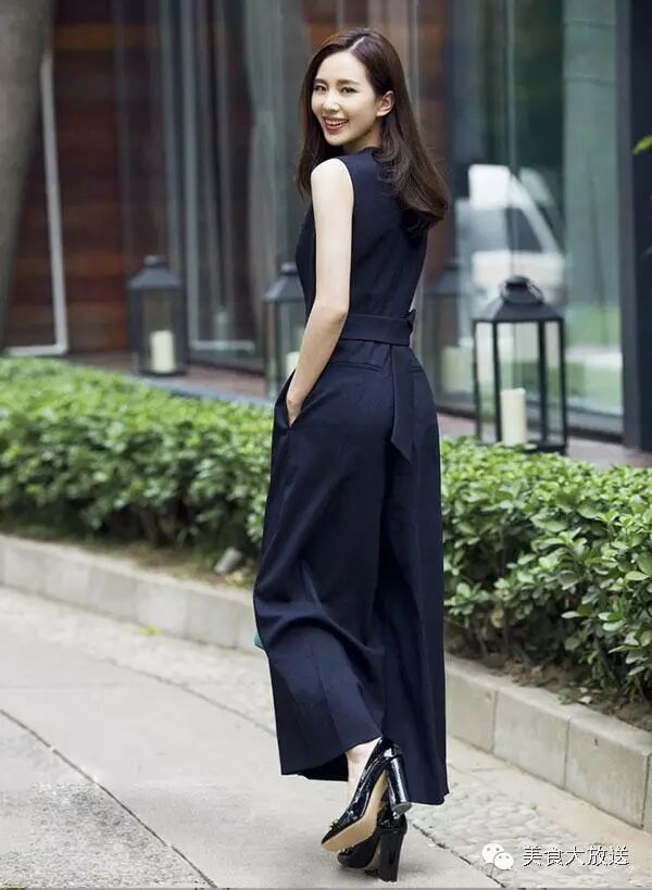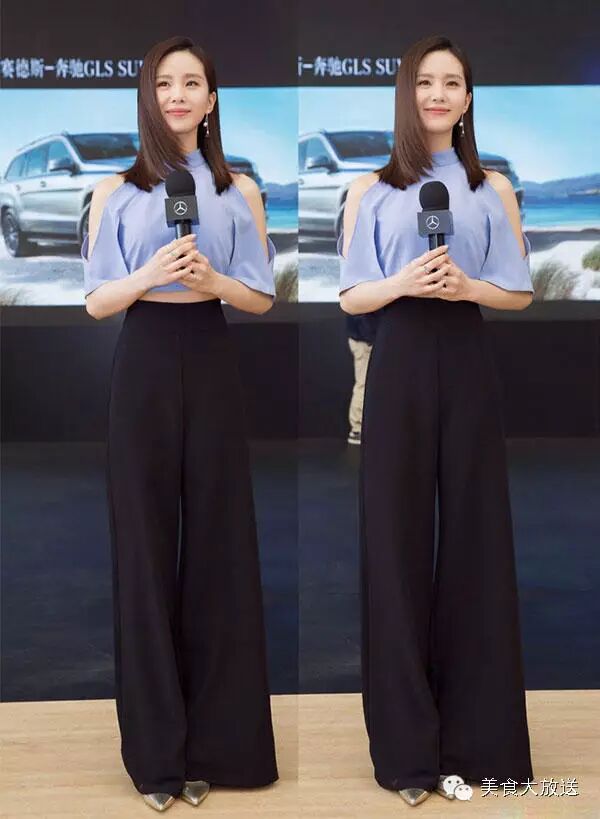 浅蓝色短款的露肩上衣带着点性感与清新小女人气质,高腰黑色阔腿裤完美的诠释了刘诗诗的这种胸部以下全是腿的高挑身材。