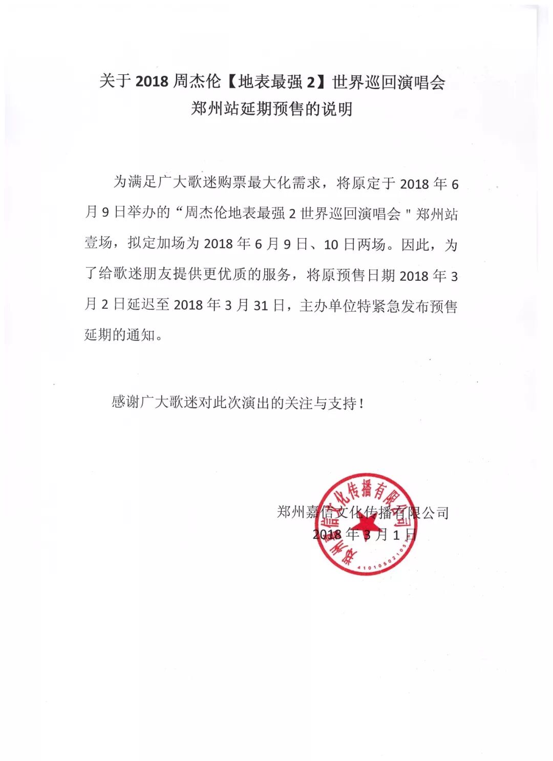为满足歌迷购票最大化需求,原定于2018年6月9日举办的 “周杰伦2018地表最强2世界巡回演唱会” 郑州站壹场,拟定加场为2018年6月9日、10日两场。因此,为了给歌迷朋友提供更优质的服务,将原预售日期2018年3月2日延迟至2018年3月31日,主办单位特紧急发布预售延期的通知。