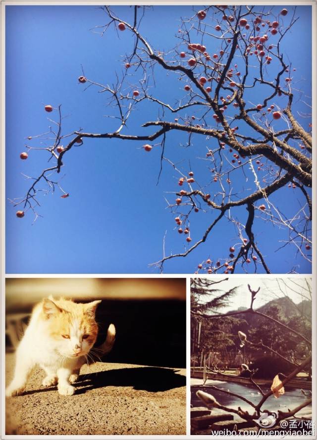 山晴空阔,疏疏一树果;逗喵猫躲,雪未下,甜不落~