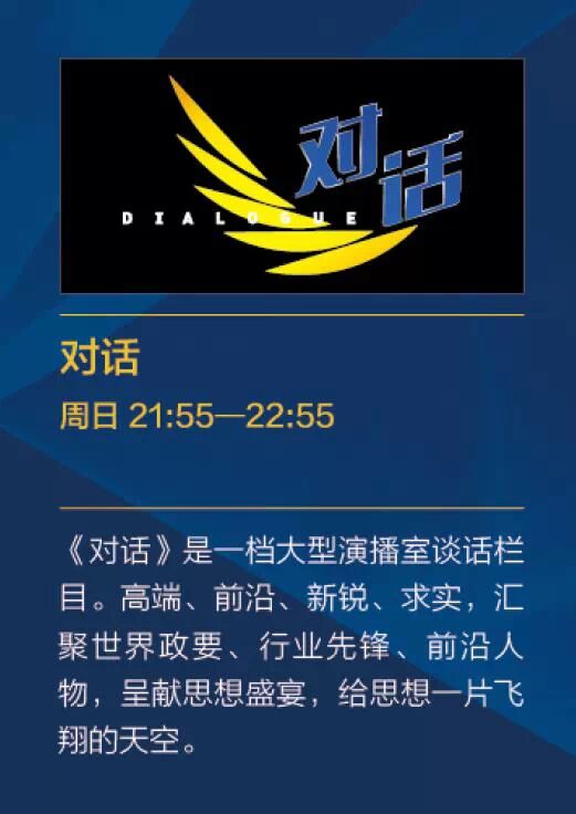 5、《对话》,播出时间周日21:55—22:55,《对话》是一档大型演播室谈话栏目,高端、前沿、新锐、求实,汇聚世界政要、行业先锋、前沿人物,呈献思想盛宴,给思想一片飞翔的天空。