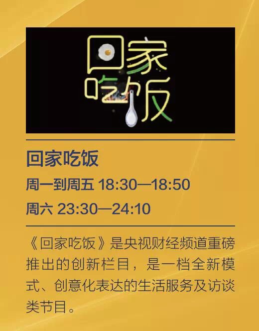 1、《回家吃饭》,播出时间周一到周五18:30—18:50,周六23:30-24:10,《回家吃饭》是为王小丫量身定制的创新节目,小丫不仅在节目里给观众带来厨艺展示,还在边做饭边聊天的过程中给大家分享生活经验和人生智慧。