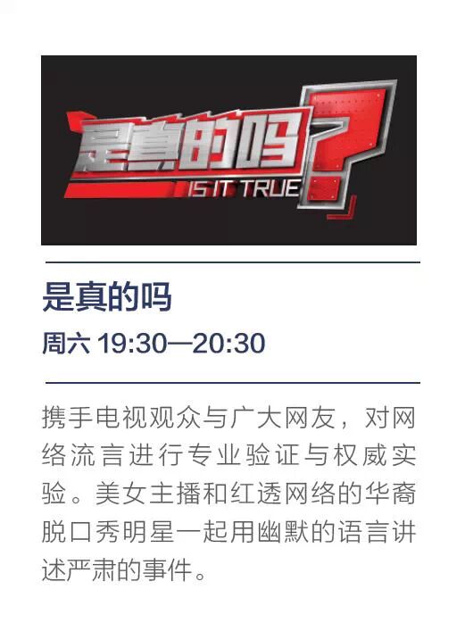 4、《是真的吗》,播出时间周六19:30—20:30,《是真的吗》携手观众与广大网友,对网络流言进行专业验证与权威实验,美女主播和红透网络的华裔脱口秀明星一起用幽默的语言讲述严肃的事件。