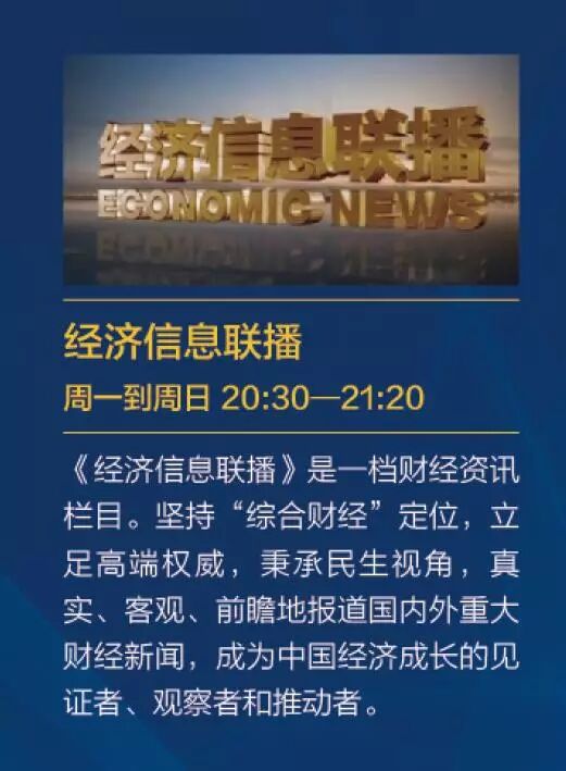 1、《经济信息联播》,播出时间周一到周日20:30—21:20,《经济信息联播》是一档财经资讯栏目,是经济领域的“《新闻联播》”,报道每天最重要的财经新闻,发布重要的经济政策并权威解读,捕捉最敏感的行业变化 。