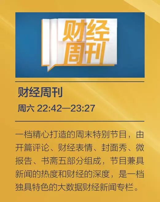 2、《财经周刊》,播出时间周六22:42—23:27,《财经周刊》由开篇评论、财经表情、封面秀、微报告、书斋五部分组成,节目兼具新闻的热度和财经的深度,是一档独具特色的大数据财经新闻专栏。