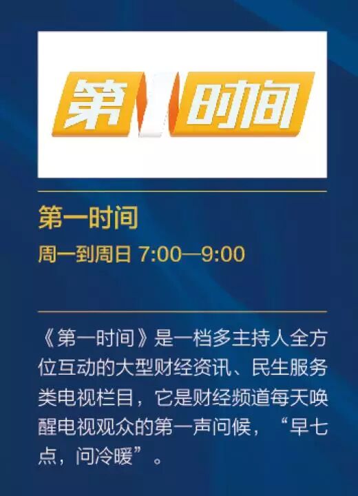3、《第一时间》,播出时间周一到周日7:00—9:00,《第一时间》是一档大型财经资讯栏目,突出“感性财经”定位,是频道全天资讯第一个发布窗口,为观众提供丰富的“新闻早餐”。