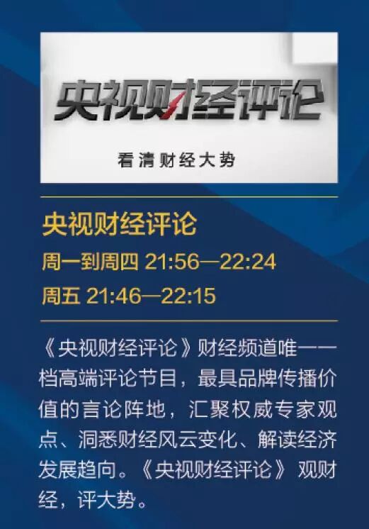 4、《央视财经评论》,播出时间周一到周四21:55—22:24,周五21:46—22:15,《央视财经评论》是一档财经评论栏目,解读政策,分析数据,把握趋势,集合权威声音,提供智慧观点。