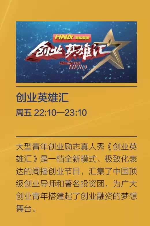 3、《创业英雄汇》,播出时间周五22:10—23:10,《创业英雄汇》是一档全新模式、极致化表达的大型青年创业励志真人秀节目,汇集了中国顶级创业导师和著名投资团,为广大创业青年搭建起了创业融资的梦想舞台。