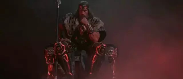 实际上,对那些可能像安·兰德一样喜欢这部电影的人来说,《柯南》是一部明显反宗教的电影。带有人物弧光的反派图尔萨·杜姆(詹姆斯·厄尔·琼斯饰演,他带着一头辫子假发)是一个邪教领袖,他拥有的庙宇,据说是好莱坞历史上最大的独立场景,而他的嬉皮士随从们,只要一声令下,都会立刻为其赴死。