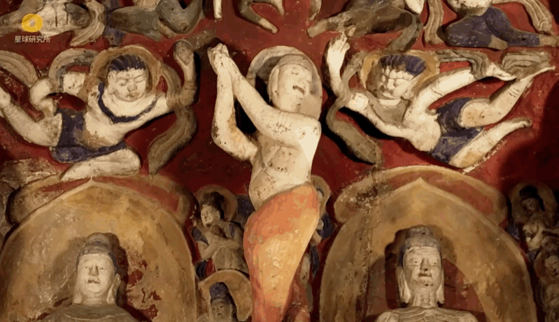 第12窟里还藏着一组飞天的”交响乐队“,只见它们罗裙翻卷、衣带飘柔,好像把你灵魂也带得飞起来。
