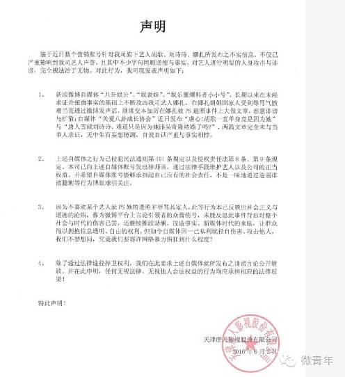 唐人表示已向上诉自媒体账号发出律师函,通过法律手段维护艺人以及公司的正当权益。6月2日下午,关八就昨日有关刘诗诗节目中的错误道歉,称是@前期张翠花@压寨张唐嫣 的低级错误,蔡艺侬女士参加了刘诗诗婚礼,两位却在节目中写没参加。刘诗诗去年接了戏,两人却写的没接戏,其中未提及胡歌单身原因、刘诗诗被雪藏等争议焦点。