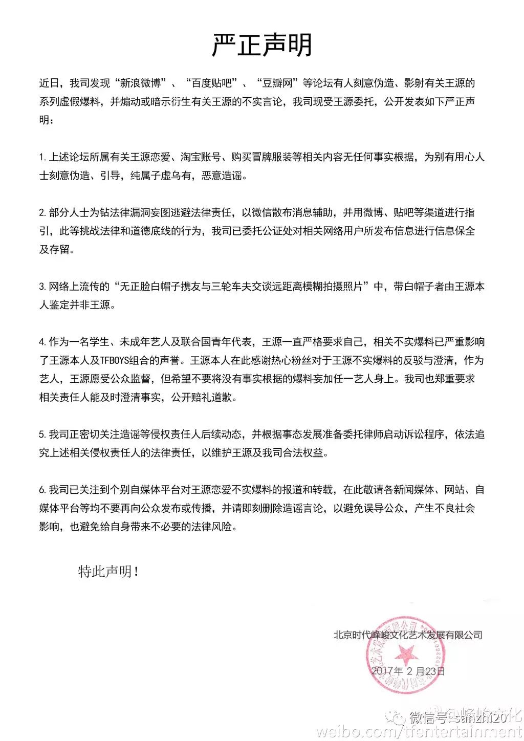 2月23日,TFBOYS成员王源所属经纪公司峰峻文化,发布了关于王源恋爱、淘宝账号、买冒牌衣服的不实传闻的声明。