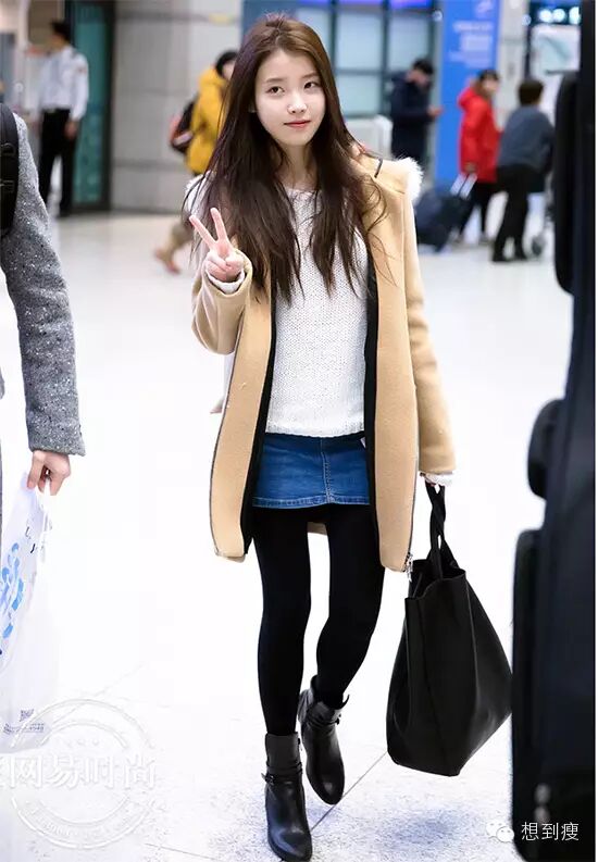 IU穿牛仔半裙+黑色保暖袜+黑色短靴。▼
