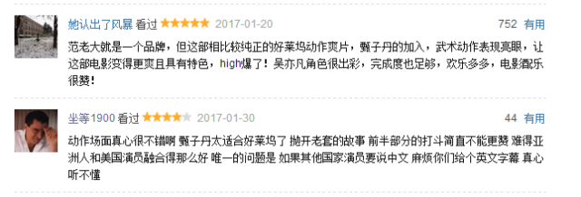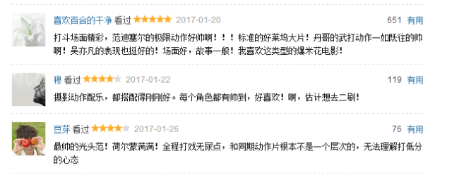 《极限特工:终极回归》在北美的上映,口碑被众多影迷称赞。众多北美网友表示,无论是明星阵容还是拽爆的动作设计,都让这部影片成为了一部定位准确、恰到好处的好莱坞动作大片。甚至部分网友表示,影片的精彩超出预期。