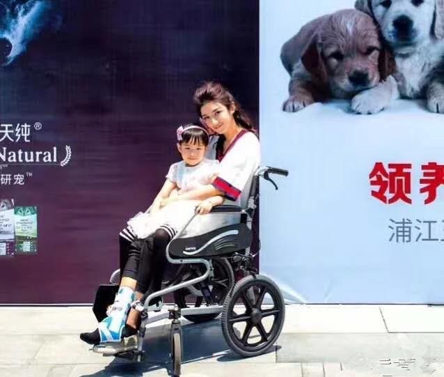 黄奕坐着轮椅带女儿参加爱狗公益活动,铛铛乖巧的坐在妈妈腿上~