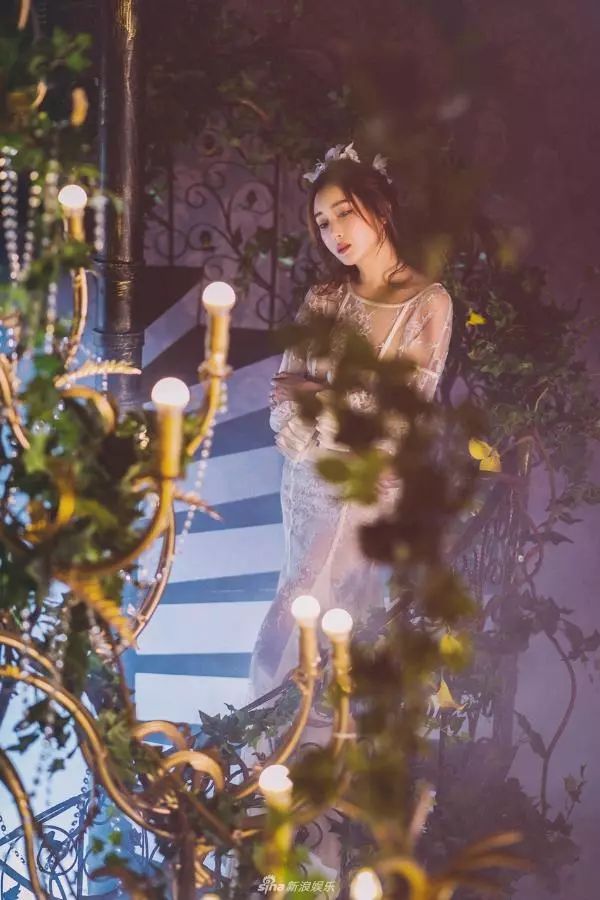 杜若溪唯美蕾丝照片曝光。若溪身穿白色蕾丝连衣裙,身上布满绿色藤蔓植物和轻柔的灯光,仿佛森是置身事外的仙子一般。