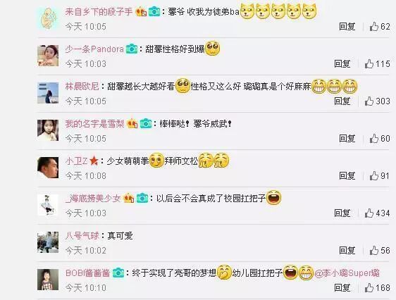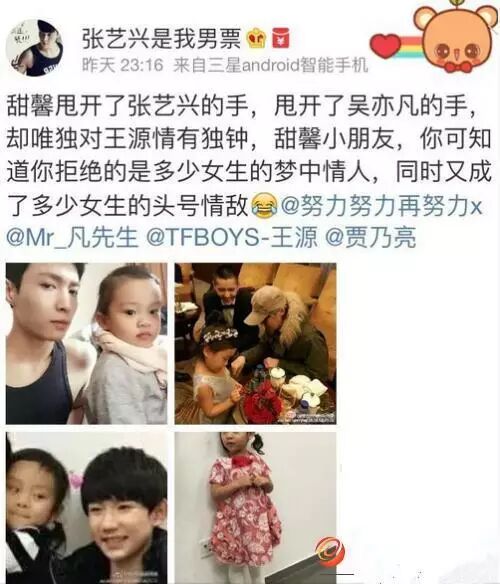 除了我们这些馨爷的普通粉,也有很多明星很喜欢小甜馨,像王源、张艺兴、吴亦凡等等