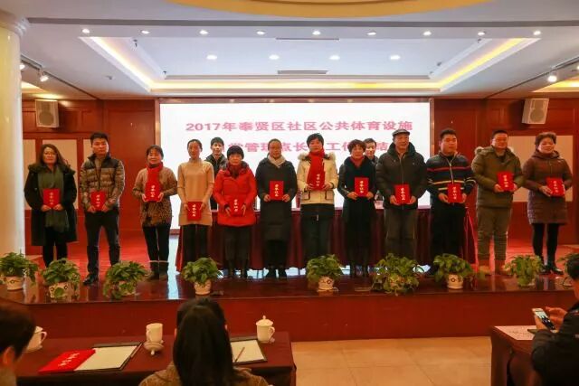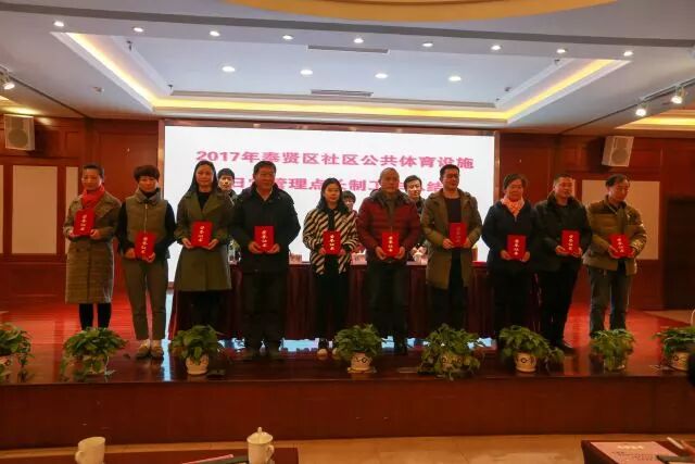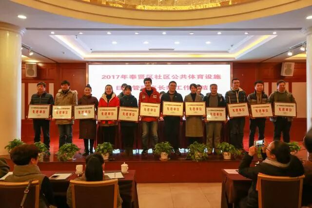 为荣获2017年奉贤区社区公共体育设施日常管理 “先进单位”负责人颁发奖牌、为2017年奉贤区社区公共体育设施日常管理“十佳优秀点长”颁发奖状、为2017年奉贤区社区公共体育设施日常管理“百名优秀点长”代表颁发证书。