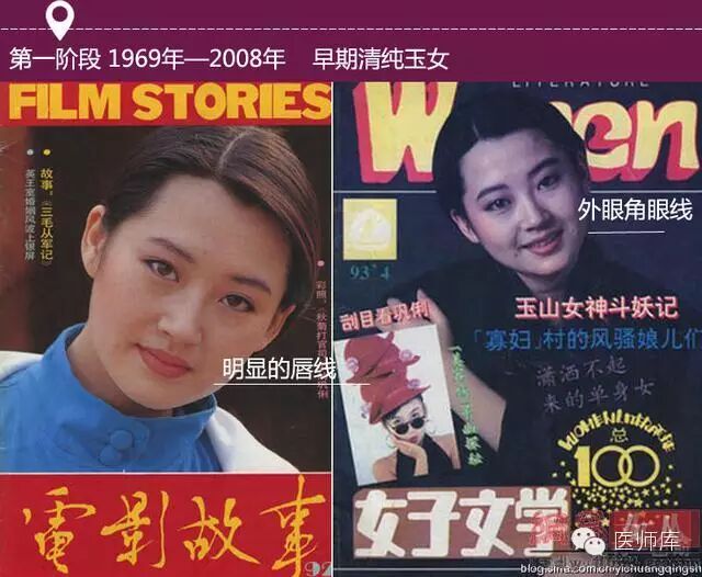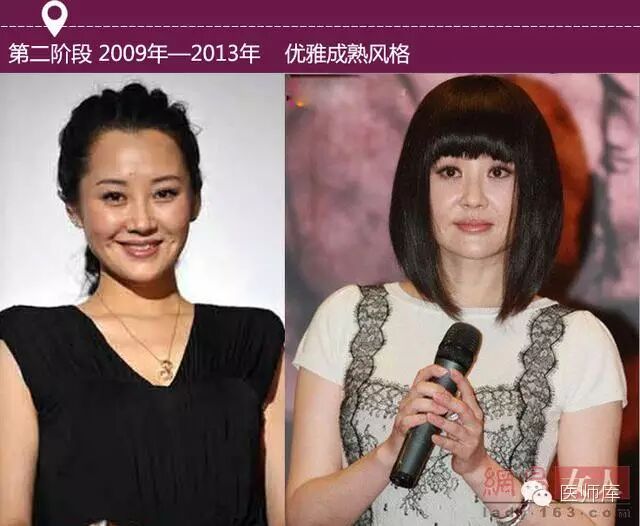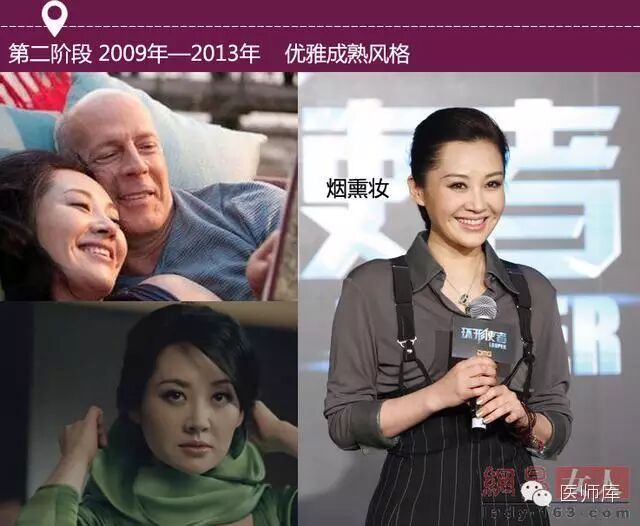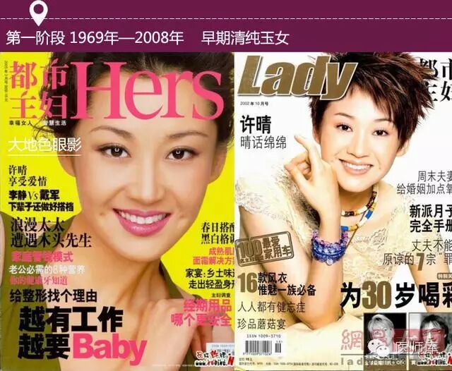 大概在90年代后期开始突出眼睛,流行浓重的眼妆。抹了腻子一样煞白毫无血色的底妆,铺满眼皮的橘红色配上鲜红的唇妆然更年轻的许晴一下老了10岁。不过自然不做作的眉形却隐约透露出许晴清纯的本色。