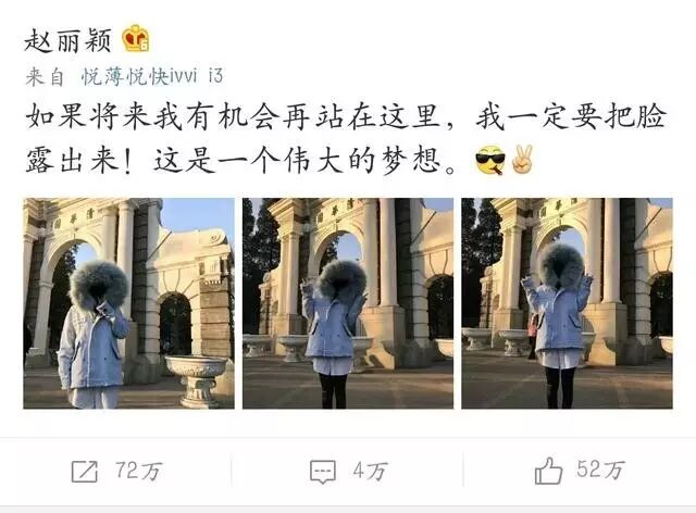 赵丽颖配文说,如果将来我有机会再站在这里,一定要把脸露出来,可以看出赵丽颖对清华北大这样高等学府的憧憬和崇敬。也有很多人猜测她因为中专的文凭感到自卑,不敢露脸。