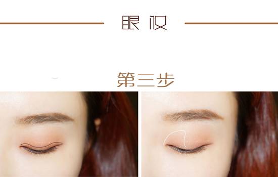 黑棕色眼线胶笔沿着睫毛根部画内眼线,之后用眼影最深色刷在靠近睫毛根部,晕染眼线,斜角刷沾眼影粉画出眼尾外眼线。米白色眼影涂抹在眼头位置。