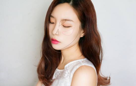 修容:全智贤的脸型偏椭圆状,面部修容主要修在脸外轮廓处,包括额头两侧发际线的位置,鼻影也要比平时下重手一点。