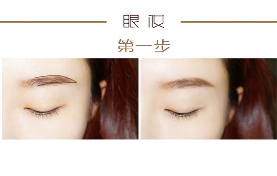 直接用眉粉填补眉毛空隙处,画出大致眉形。染眉膏减弱自身眉毛颜色。涂抹眼部打底之后大范围涂抹哑光肤色或米白色眼影在眼皮。