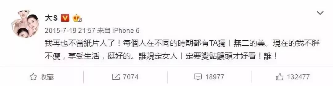 大S还发微博:“我再也不当纸片人了!每個人在不同的時期都有TA独一无二的美。