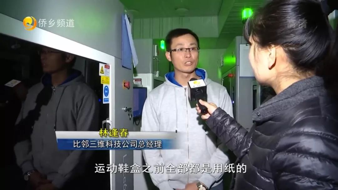比邻三维科技公司总经理 林逢春:我们现在在打印的是一个运动鞋盒,运动鞋盒之前全部都是用纸的,现在我们创新直接用塑料来做,因为随着最近纸的价格在上涨,还有纸的二次使用概率很低,我们把它做成塑料的它可以实现二次使用。