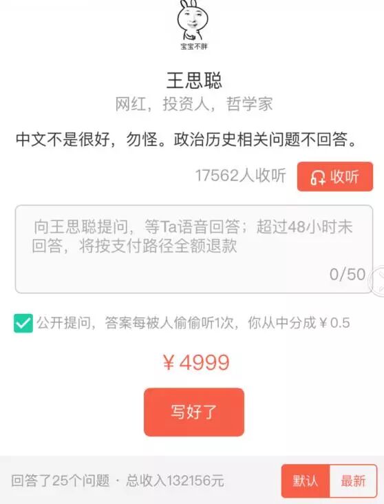 到目前为止,王思聪一共回答了25个问题,收入超过13万,吸金能力令人叹为观止。