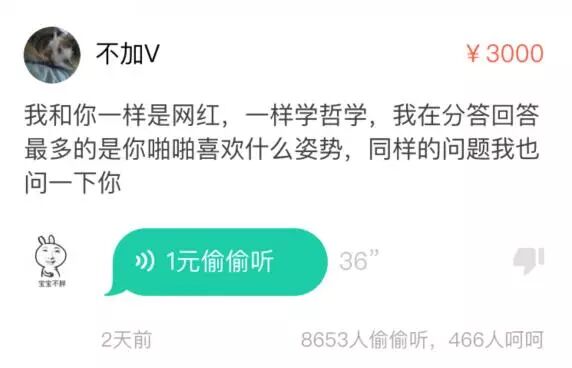 在这里需要先介绍一下分答的游戏规则:用户在分答上介绍自己擅长的领域,设置付费问答的价格,1元到500元之间,其他用户感兴趣就可以付费向其提问,回答必须是语音,时间限制在60秒内。而如果有人对这个问题的答案感兴趣,可以付费1元选择“偷听”,提问者与回答者都可以得到0.5元,也就是说提问者也可以赚钱。