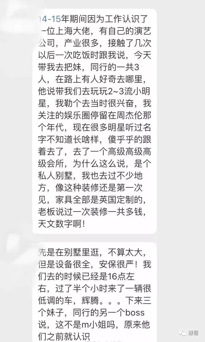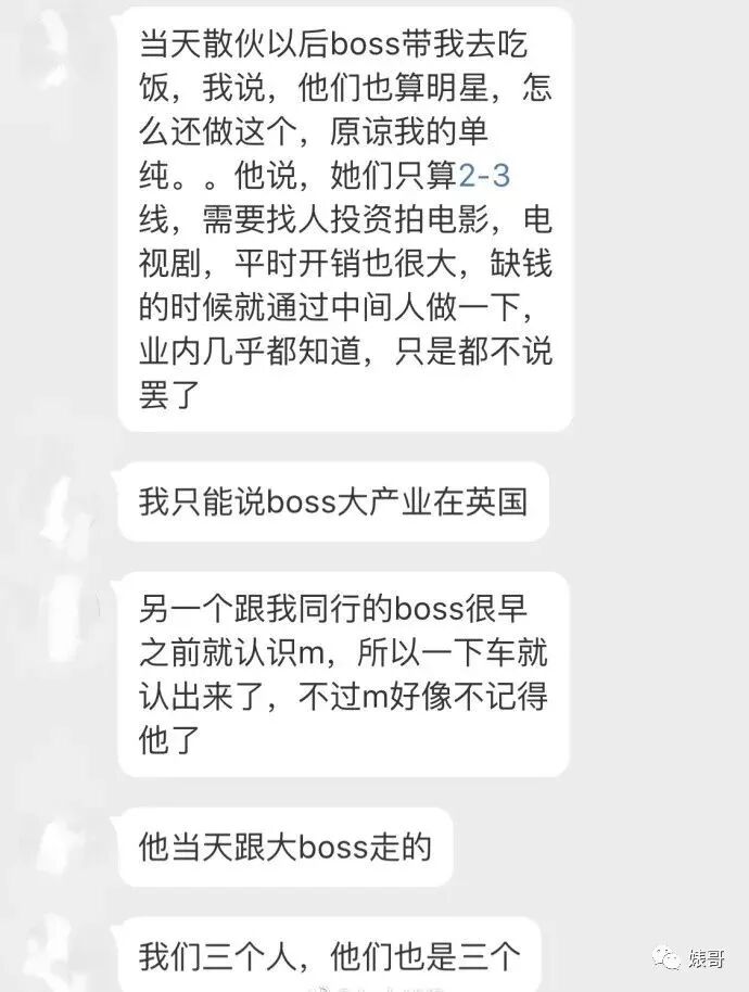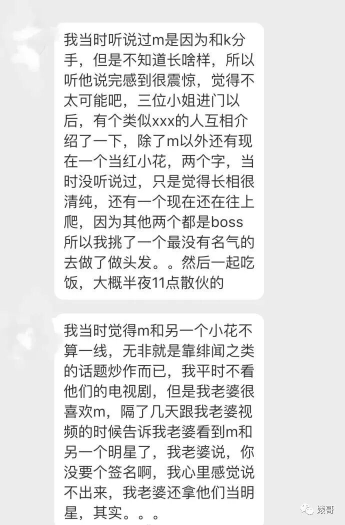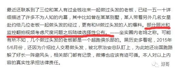 这篇爆料除了这个“三人做头发”的事,还疑似暗指马苏是圈内老鸨,称和马苏一起做过头发的老板透露在某某别墅,M带着另外几位女星赴约给几位老板一起“做头发”,部分照片和监控翻拍视频考虑尺度问题之后会陆续选择性公布