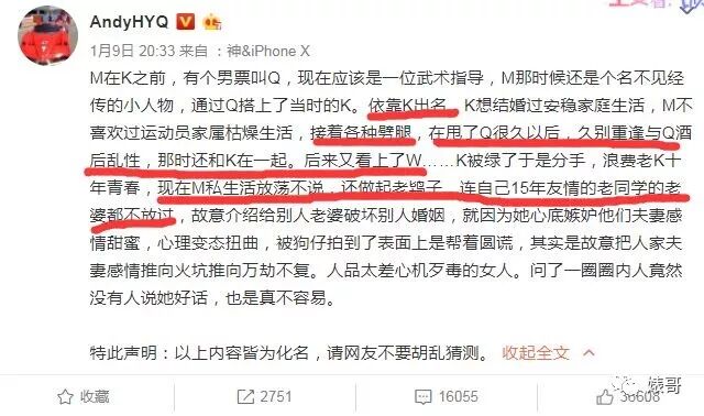 1月9号,黄毅清在微博里发了一段“M小姐劈腿史”的文字:M依靠K出名,浪费K十年青春,期间各种劈腿,久别重逢后与前男友Q酒后乱性,后来又看上了W,K被绿后分手。微博中还称M私生活放荡,还做起了老鸨子,连自己15年友情的老同学的老婆都不放过