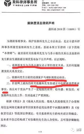随后张继科工作室也发布了声明,称张继科和马苏是正常朋友关系、张继科是现役运动员、流言已经严重违背事实,将对编造谣言及继续传播谣言的相关责任人追究法律责任