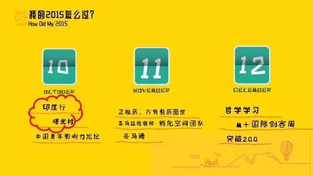 我从2014年的时候开始,每年给自己定关键字,2014年定的关键字是学习和积累。因为那个时候什么都没有,一点资源都没有,对创业和互联网都了解得很少。