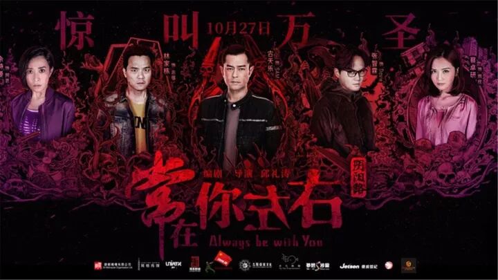 古天乐、张智霖、林家栋、蔡卓妍、佘诗曼五位主演分别置身怨力之中,被与各自角色紧密相关的元素图腾贯穿缠绕,古天乐背后后黑白无常的骷髅头面目狰狞,张智霖身前的锯子与铁锤似乎暗藏杀机,林家栋倚靠精致的棺木,揭开的一角露出一只佩戴龙凤镯的手,阿Sa身后是旅店元素,一片墓碑倾倒在身前,佘诗曼背后两只手枪十分抢眼,散落在面前的唱片似乎在播放令人惊恐的旋律。不同图腾元素的缠绕使整幅海报在美轮美奂的同时意境恐怖异常,细看之下让人不寒而栗,五人脸上复杂的面部表情更令人浮想联翩,折射出影片离奇诡秘的故事脉络。除此之外,该片的档期选择也颇为用心,依托万圣节的鬼魅节日氛围,《常在你左右》10月27日恰时上映,相信这一道纯港式恐怖盛宴将巧妙刺激受众的观影神经。