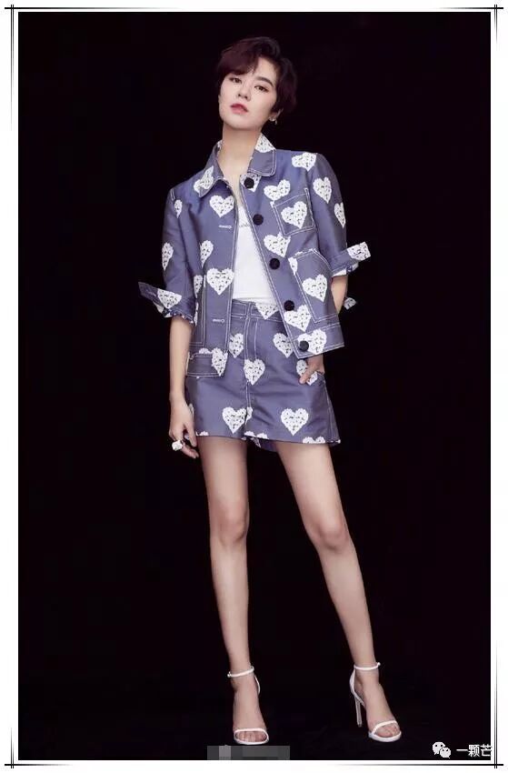猛然看过去像牛仔款的穿搭,上身一件紫罗兰色的外套,上面印着白色的心,下身是同款面料的短裙,一双白色细带的高跟鞋。郁可唯的身材真的是非常好呀,加上一件若隐若现的白色内搭,青春靓丽的气质扑面而来。