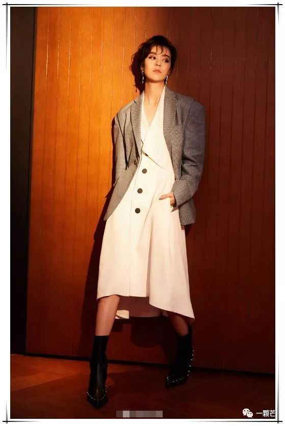 一件白色的长裙,前短后长的裙摆加上不规则的领口设计,加上脚上一双黑色的铆钉靴,外面搭上一件灰色的西服外套,给人一种慵懒随性,放荡不羁的感觉。