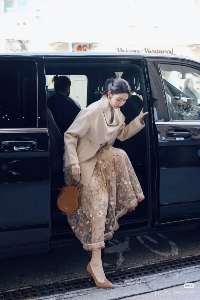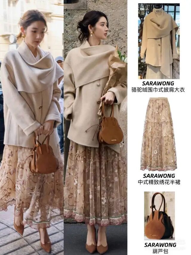 骆驼绒围巾式披肩大衣,以极简廓形和高级面料营造法式优雅的松弛感;中式精致绣花半裙则有着东方美学的细腻雅致,整体散发着“中西合璧”的独特格调;驼色尖头高跟鞋的加入,让整套穿搭更具女性魅力,每一件单品都在风格与色彩上形成呼应;这套造型非常适合都市通勤、轻奢聚会等正式场合,既展现出高级时装的质感,又有文化底蕴。