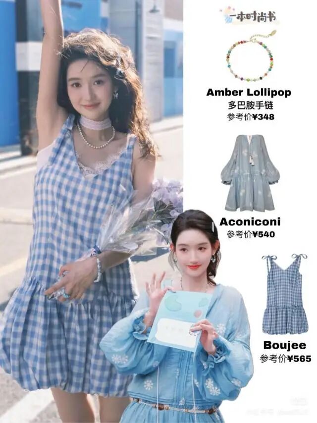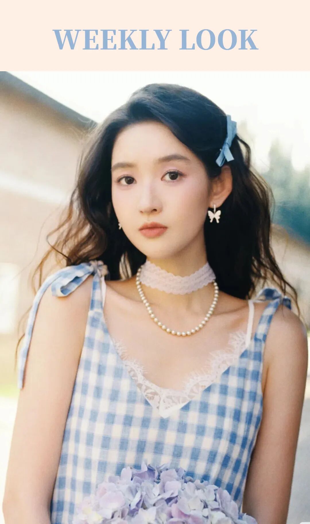 蓝白格纹吊带裙带着随性的法式浪漫,蕾丝choker与珍珠项链搭配多巴胺手链的又添几分俏皮,整体像从文艺电影里走出来的少女,慵懒又不失腔调。